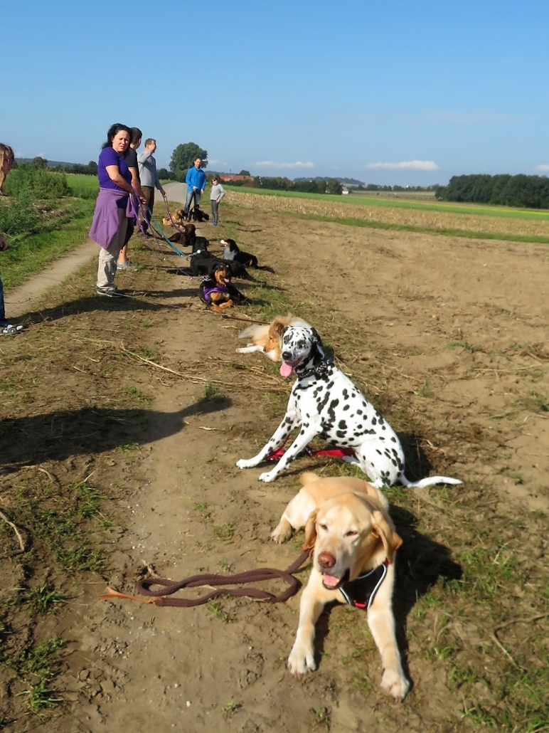 In diesen Übungsstunden werden die Hunde langsam an den Umgang mit Pferden herangeführt. Ziel ist, dass der Hund gelassen bleibt und weder panisch wegläuft, noch voller Enthusiasmus sich Pferd und Reiter nähert.